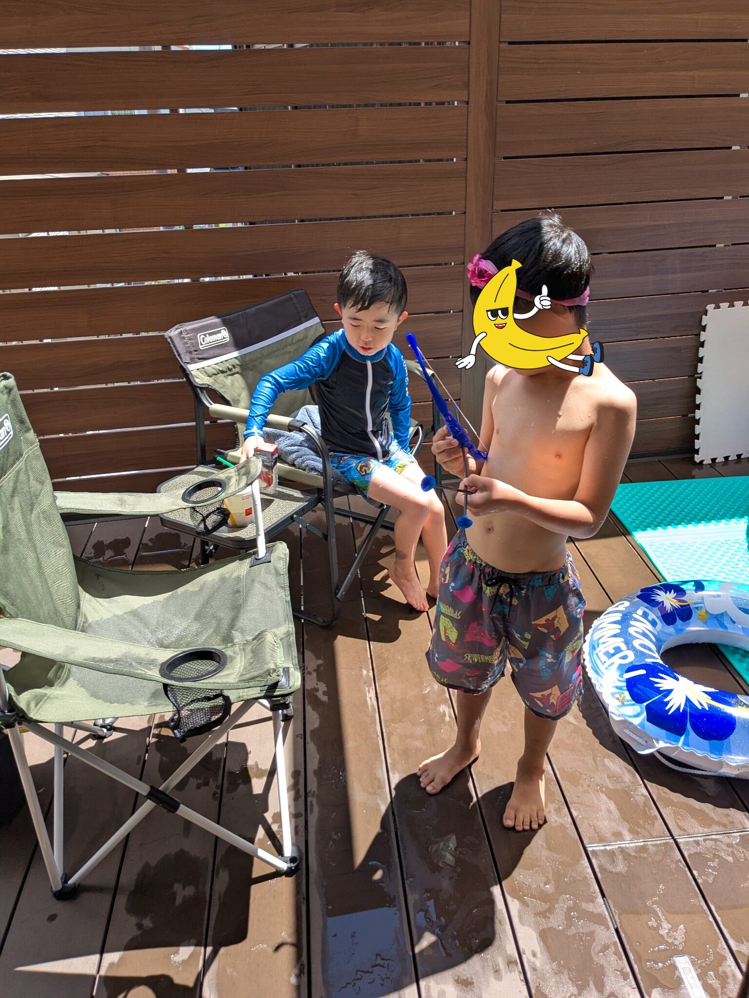 今朝も学校に行く前に水遊びしたいというので、バルコニーで遊んでいました。